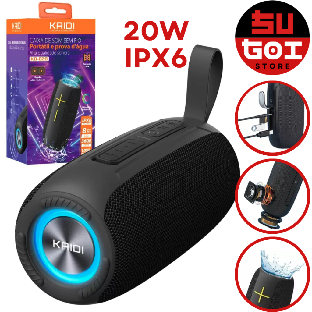 Caixa de Som Bluetooth 20W à Prova d'água IPX6 Led RGB - Kaidi - KD-828