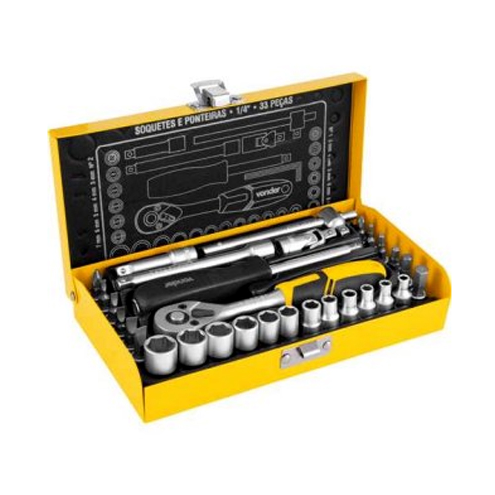 Jogo Soquetes Kit 33 Peças 1/4 Polegadas Chave Catraca Barra Extensora Cabo T Vonder Profissional Ferramentas Maleta