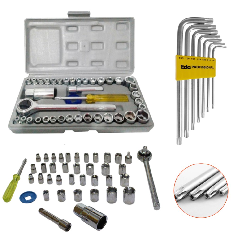 Kit Reparo Mecanica Jogo De Soquete 40 Pcs + Jogo Chave Torx 7 Pcs T10 A T40
