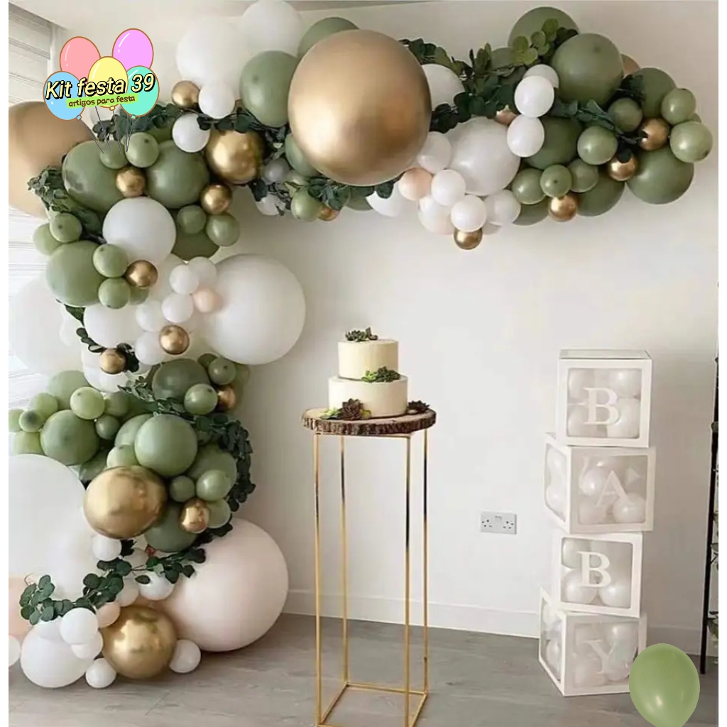 Kit 129 Balões Bexiga Liso Verde Eucalipto N9 + Branco N7 + Dourado Cromado N5 + Big Dourado + Big Branco Metalizado Festa