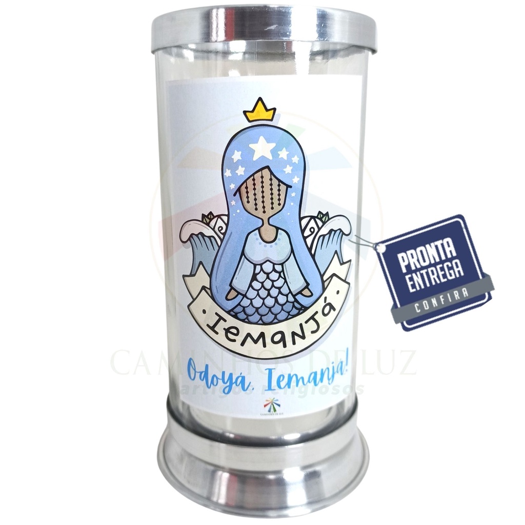 Porta Vela 7 Dias Iemanja Vidro Resistente Forte Antichama Orixá Umbanda Candomblé Base de Alumínio