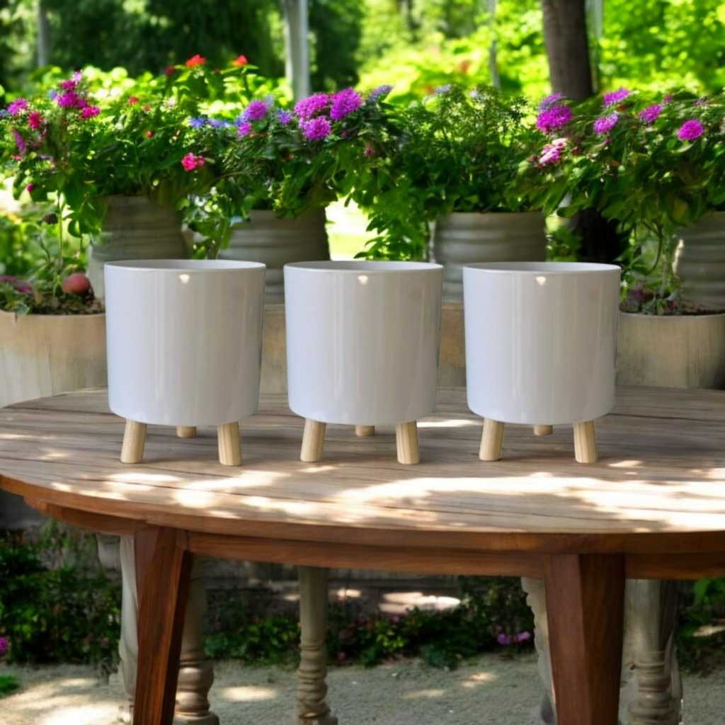 Cachepot Plástico Branco Kit com 3 Unidades com Pés De Madeira 15,5 X 14,0 cm (Sem Pés) 15,5 x 19,0 (Com Pés)
