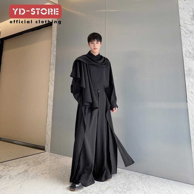 Camisa Chinesa de Manga Longa para Homens de Primavera 2024 Novo Estilo Cor Sólida Série Dark Black High-End Design Niche Irregular Multi-Piece