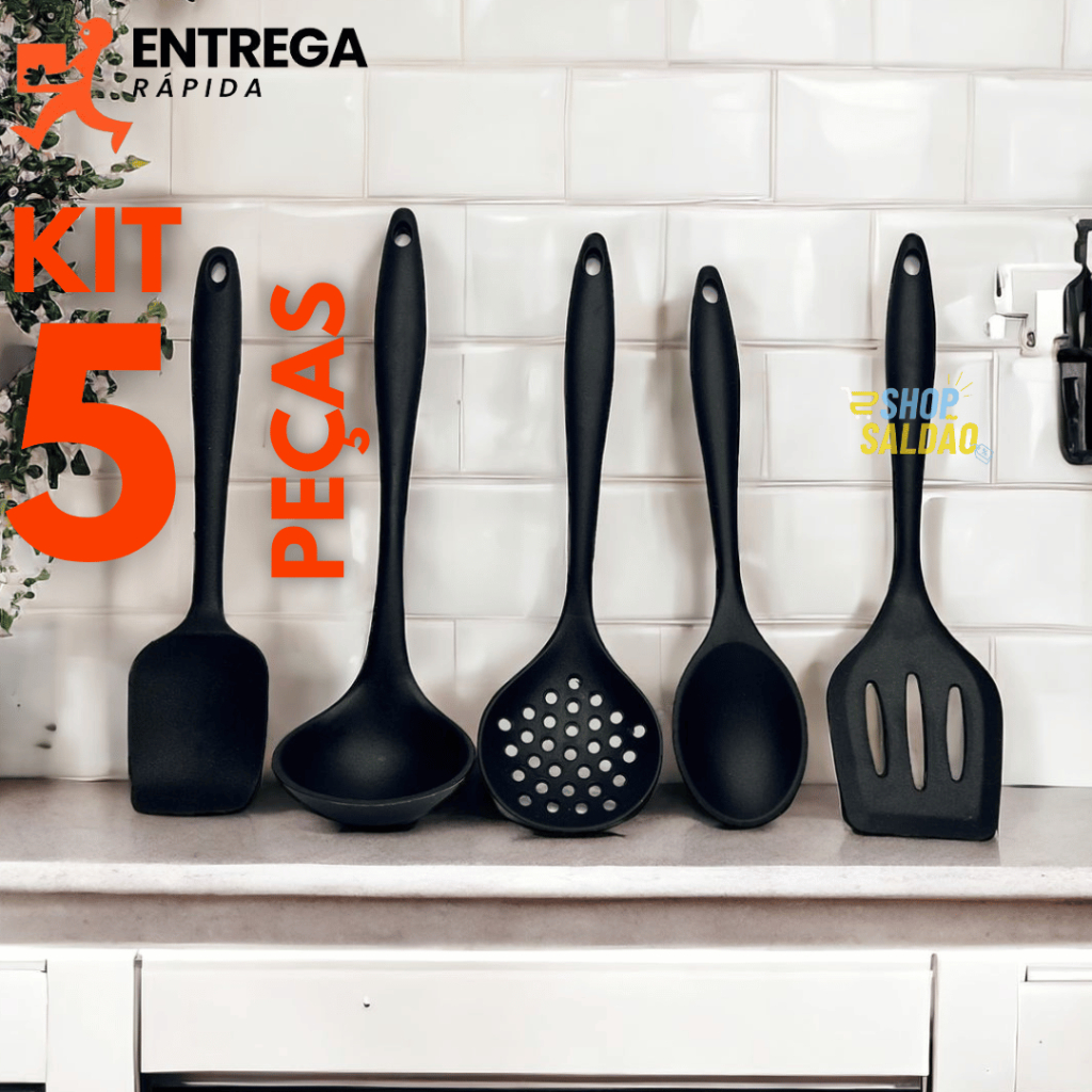 Kit Utensílios 5 Peças de Silicone 1 Concha 1 Escumadeira 1 Colher de Arroz 1 Espátula Reta e 1 Espátula Vazada Kit Silicone Preto ou Vermelho