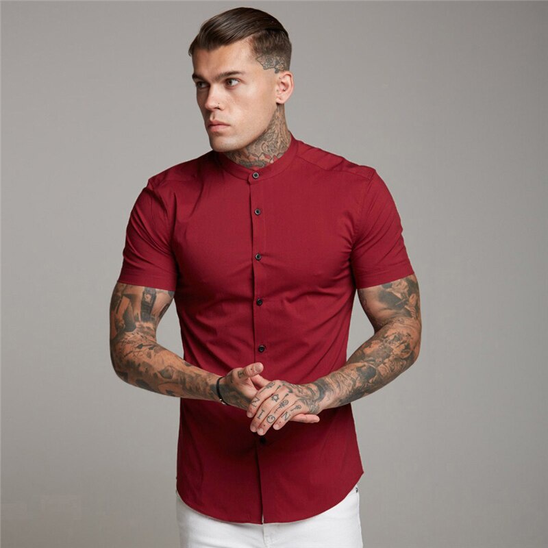 Camisa Social Masculina Slim Fit Com Manga Curta Com Gola Padre Vinho