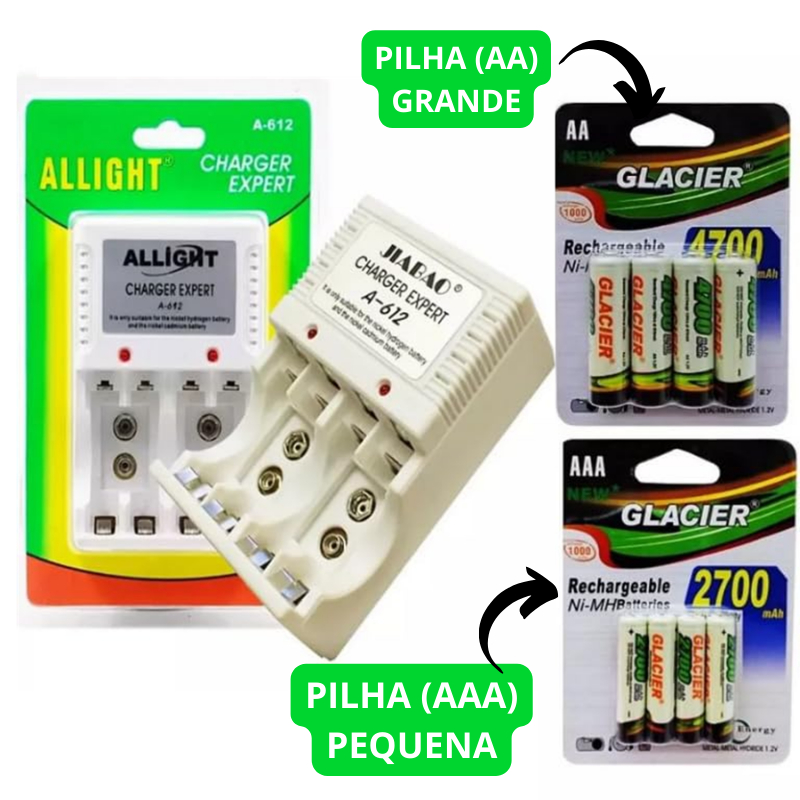 Kit Carregador + 4 Pilhas (AAA palito) (AA Normal) Recarregável