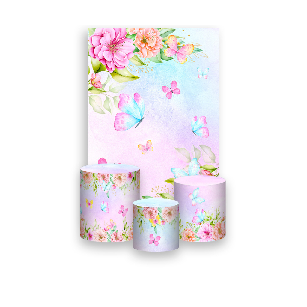 Painel De Festa Vertical 1,5x2,2 + Trio De Capa Cilindro - Borboletas Aquarela Floral 013