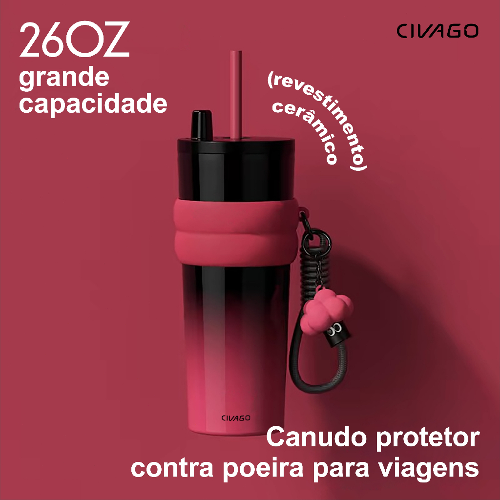 Civago Copo Térmico 770ml Inox com Cerâmica Pingente Tampa Antivazamento Quente 8h Frio 16h