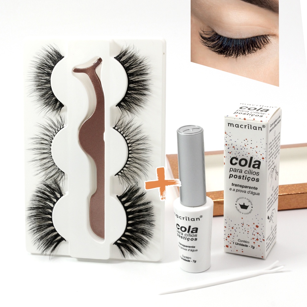 Kit de Cílios com Cola Macrilan a prova d'água 3 par de Cílios e Pinça Aplicadora