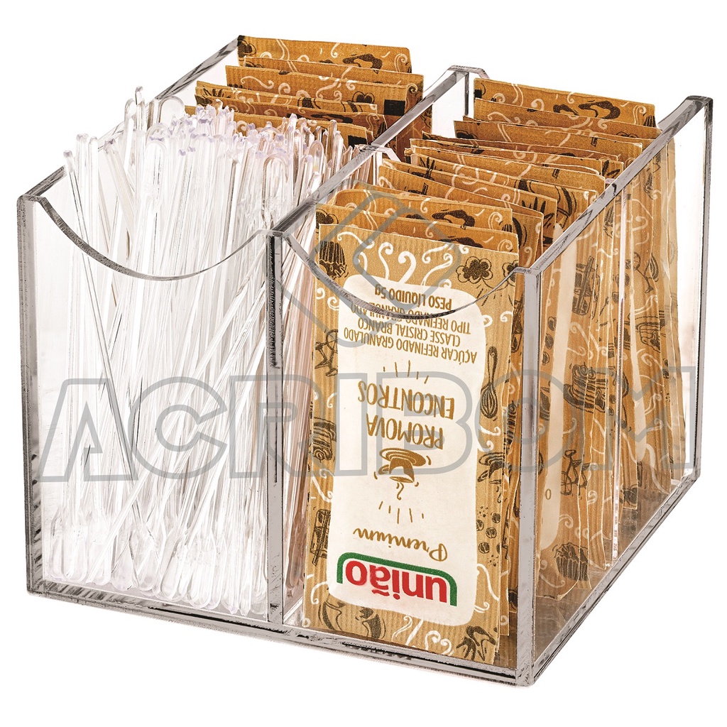 Caixa Porta Açúcar Organizador de Sachês Com Divisórias 4 Compartimentos em Acrílico Cristal Transparente Sem Tampa - Acribom