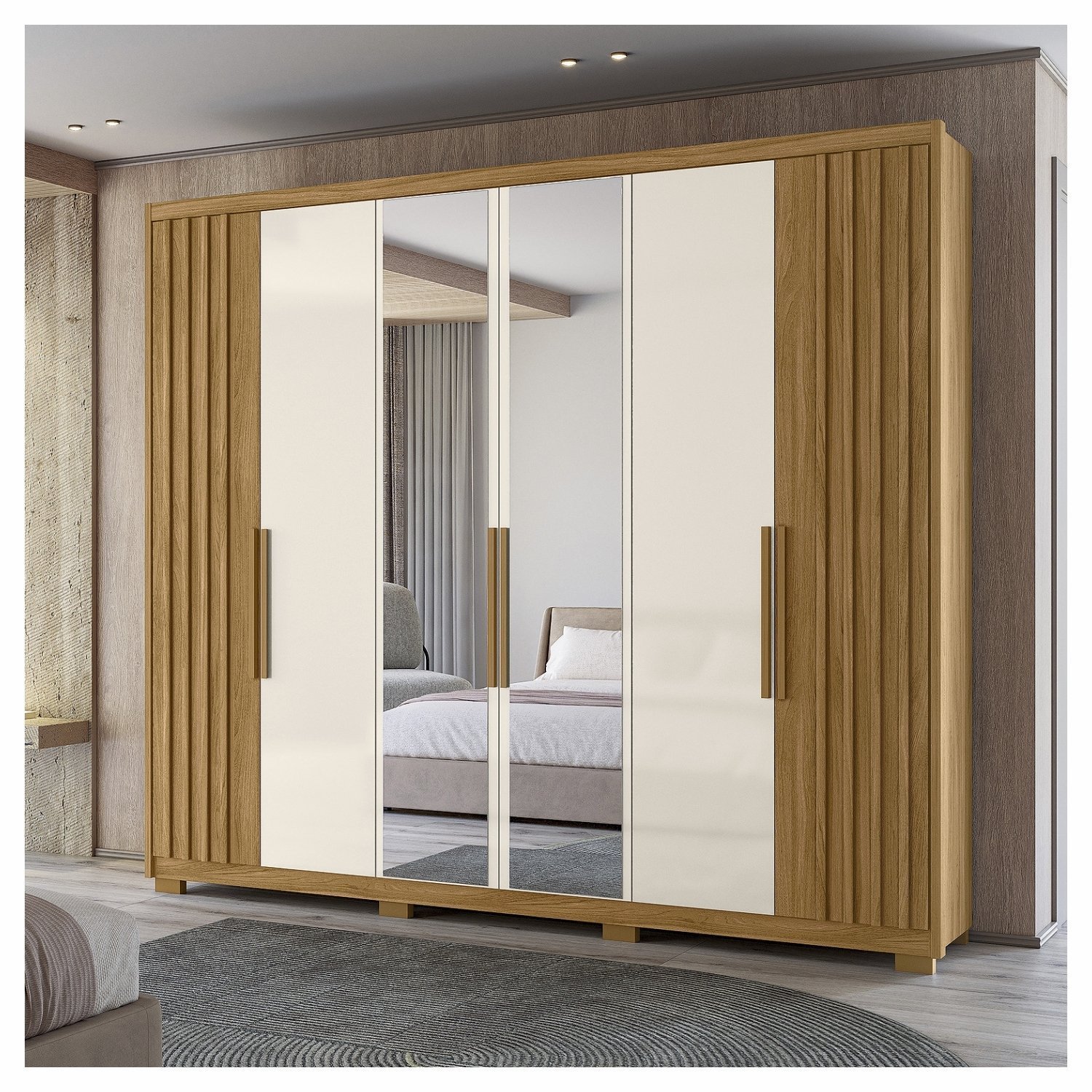 Guarda Roupa Casal Gelius Absolut Ripas autênticas 100% MDF 273 cm largura 6 portas 4 gavetas com espelho e pés Castanho OFF White